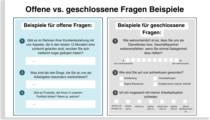 Einsatzgebiete: In Kundenfeedbacks, Interviews oder kreativen Prozessen ermöglichen offene Fragen detaillierte Meinungen und neue Ansätze. Was sind Beispiele für offene Fragen? „Was hat Ihnen besonders gut gefallen?“ oder „Wie könnten wir uns verbessern?“. Sie sind ideal, wenn mehr als nur klare Zahlen benötigt werden, sondern persönliche Perspektiven oder innovative Ideen gefragt sind.