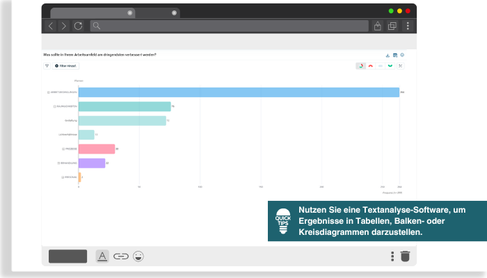 Mit dieser Mischung aus Quantifizierung und qualitativer Tiefe bleiben wichtige Inhalte erhalten und werden gleichzeitig strukturiert und aussagekräftig präsentiert. Die Ergebnisse geben Aufschluss darüber, welche Themen für die Befragten am wichtigsten sind und wo eventuell Handlungsbedarf besteht. So können Sie fundierte Entscheidungen treffen und die nächsten Schritte gezielt priorisieren.