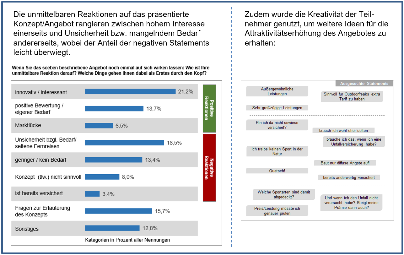 Neben den quantitativen Ergebnissen erbrachte auch die Auswertung der offenen Fragen bereits erste wertvolle Hinweise für den Auftraggeber. Im Rahmen dieser Befragung ging es unter anderem darum, die unmittelbaren Eindrücke der Befragungs-teilnehmer beim ersten Kennenlernen des neuen Konzeptes zu erfassen.