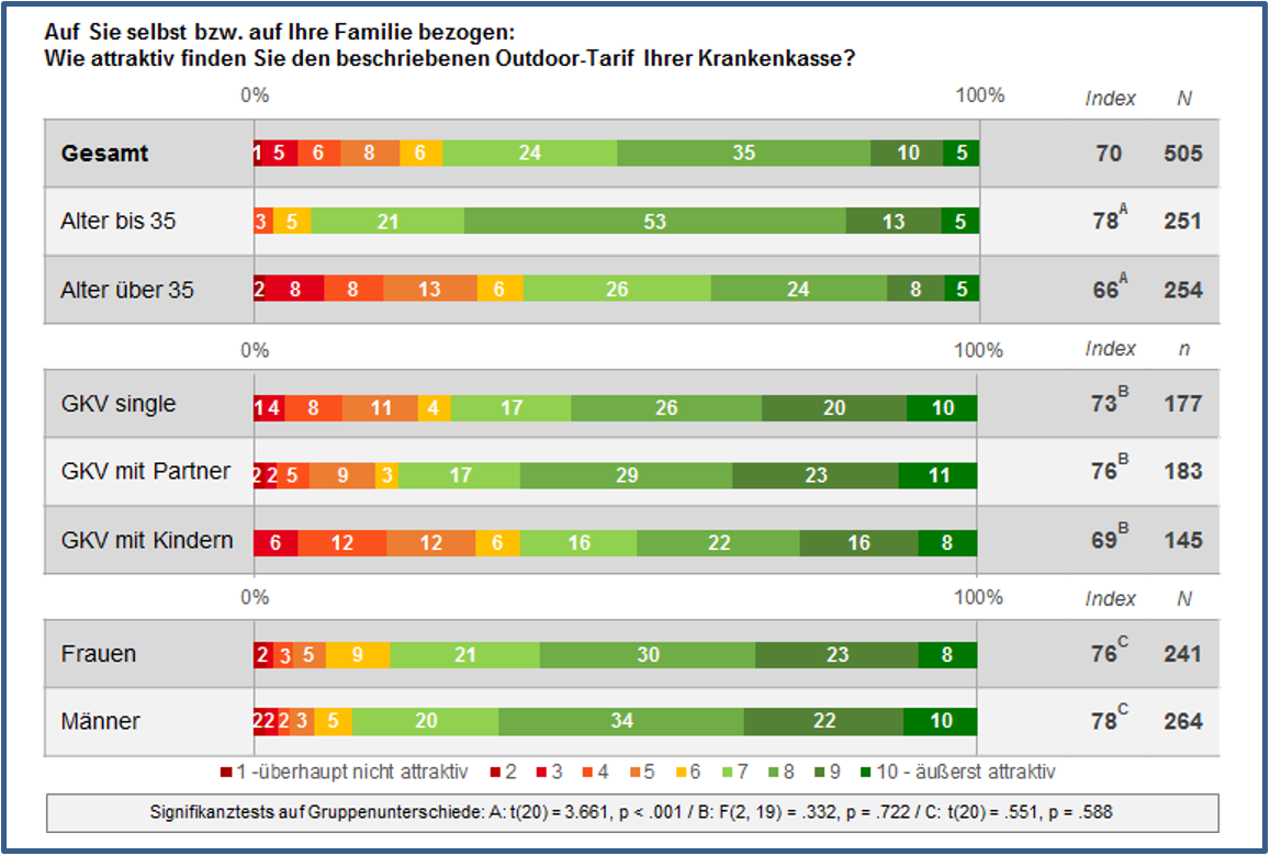 Neben der Betrachtung des Gesamtergebnisses bestand ein weiterer wichtiger Analyseschritt darin, wichtige Subgruppen zu isolieren, in denen sich relevante Resultate ausdifferenzieren. Im konkreten Fall konnte mit dieser Analyse unter anderem festgestellt werden, dass die Attraktivität des dargestellten Konzepts/Angebots auf Basis der ermittelten Werte überraschend substanziell war (s. Abb. 2). Die erwartbare Präferenz für den Tarif bei jüngeren Personen sowie bei Männern zeigte sich auch in den Daten, wobei die Differenz in der Einschätzung der Attraktivität des Angebots zwischen den beiden Altersgruppen statistisch signifikant war. Interessant war auch die leicht erhöhte Attraktivität des Konzepts für Personen, die einen mitversicherten Partner haben (s. Abb. 3).