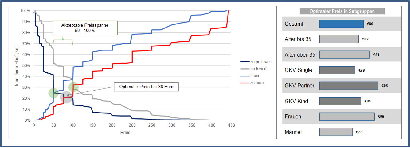 Zur Ermittlung der Preisbereitschaft bzw. Preissensibilität der Teilnehmer wurde im Rahmen der Befragung die etablierte Van-Westendorp-Methode verwendet – auch Price Sensitivity Meter (PSM) genannt. Diese Methode erfragt zunächst geeignete Preise für ein Produkt auf verschiedenen Schwellen und errechnet hieraus eine optimale Preisspanne, bei der das höchste Marktpotenzial aufgrund der empfundenen Wertigkeit eines Angebotes zu erwarten ist.