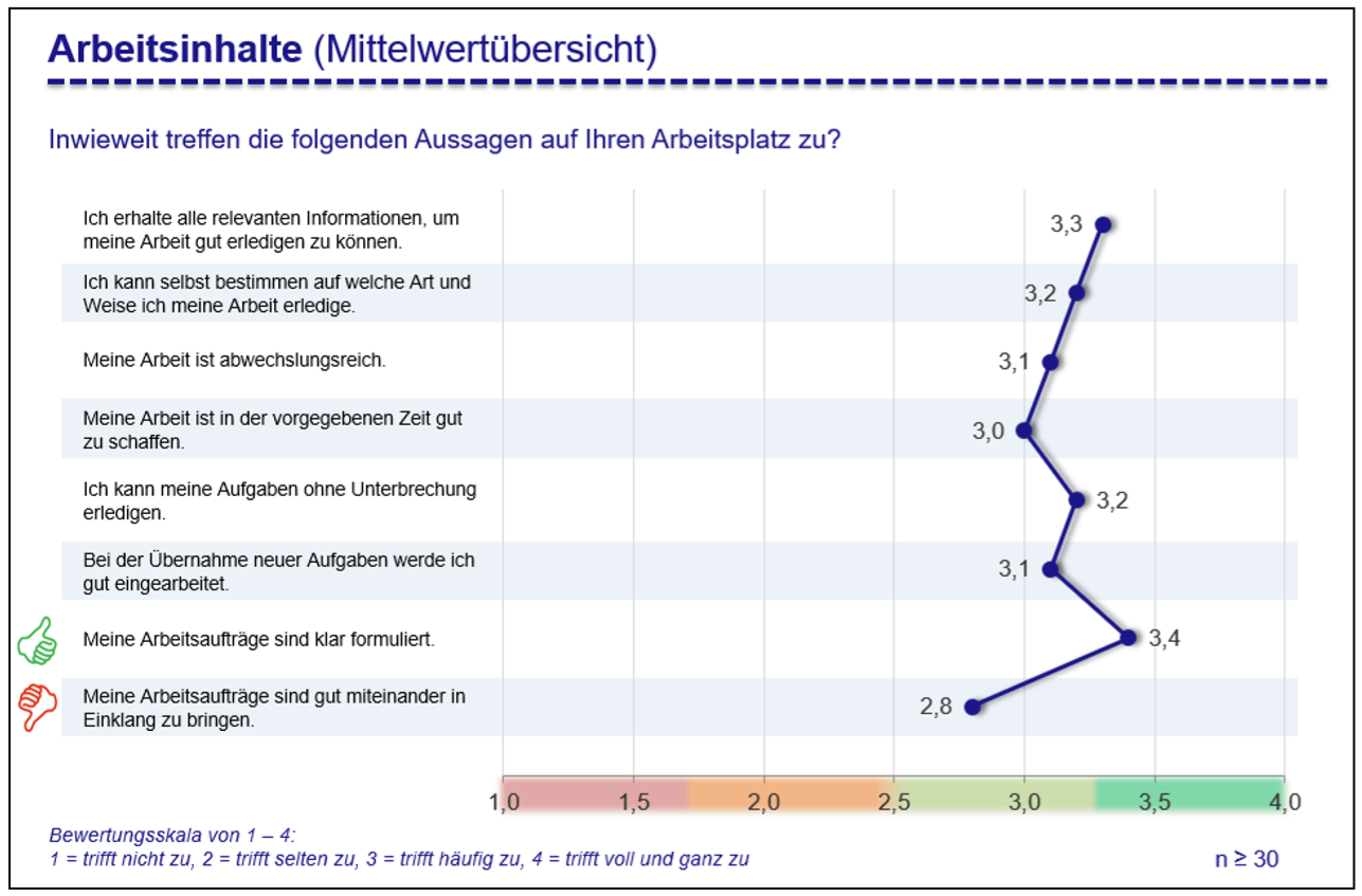 Sofern möglich, werden in den Tabellen und den Ergebnisberichten auch die Ergebnisse von Untergruppen wie Standort, Team, Gruppe oder ähnliches ausgewertet. Dies erfolgt jedoch nur, sofern die Anonymitätsschwelle von mindestens sechs Personen erreicht wurde und auch durch Differenzprüfung kein Rückschluss auf Personengruppen von weniger als sechs Teilnehmern möglich ist. Seitens unseres Kunden werden die bereichsspezifischen Auswertungen den jeweiligen Verantwortlichen in den Abteilungen an die Hand gegeben, sodass diese kontinuierlich über die Situation in ihrem Bereich informiert sind und zeitnah auf kritische Entwicklungen reagieren können.