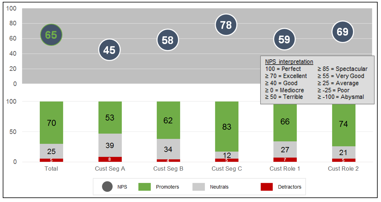 Wenig überraschend war die Erkenntnis, dass dem Anbieter fast durchweg eine sehr hohe Kundenorientierung attestiert wurde. Dies ging einher mit der Zuordnung von umfangreicher Erfahrung, hoher Zuverlässigkeit und ausgeprägter Professionalität. Aus-druck dieser Erkenntnisse ist unter anderem auch der NPS®, welcher im Rahmen beider Befragungswellen erhoben wurde und der über eine einfache Frage zur Weiterempfehlungsabsicht die Begeisterung der Kunden misst. Wenngleich die NPS®-Werte zwischen den Kundensegmenten bzw. auch in verschiedenen Kundenrollen schwankten, so lagen diese Werte für den B2B-Bereich doch auf einem außergewöhnlich hohen Niveau.