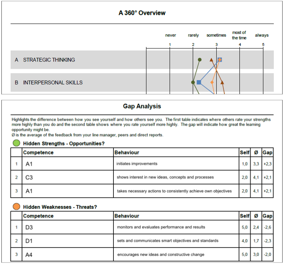 Im Anschluss an die Befragung wurde jeder Führungskraft ihr persönlicher Ergebnisbericht zum Download zur Verfügung gestellt. In diesem Report wurde das Feedback in grafischer und verständlicher Form dargestellt. Hierbei wurde insbesondere die Gegenüberstellung der verschiedenen Perspektiven in den Vordergrund gerückt und ein Abgleich von Selbst- und Fremdbild vorgenommen, um verborgene Stärken und Schwächen des Feedbacknehmers zu erkennen (s. Abbildung 3).