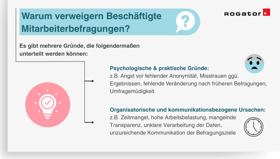 Häufige Gründe sind negative Erfahrungen aus früheren Befragungen, fehlende Umsetzung von Maßnahmen oder generelles Misstrauen gegenüber dem Unternehmen.