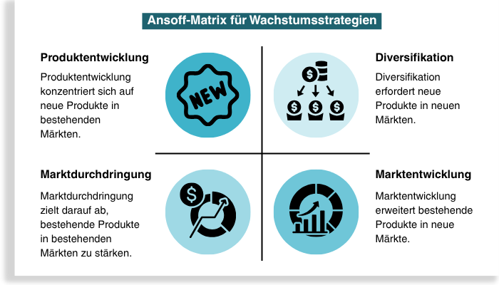 Die Ansoff-Matrix ist ein strategisches Instrument zur Entwicklung von Wachstumsstrategien. Sie hilft Unternehmen dabei, systematisch zu entscheiden, wie neue Märkte erschlossen oder bestehende Produkte weiterentwickelt werden sollen. Die Matrix unterscheidet vier Strategien: Marktdurchdringung, Marktentwicklung, Produktentwicklung und Diversifikation. Sie ergänzt klassische Portfolioanalysen vor allem im Marketing und in der strategischen Planung eingesetzt, wenn es um Wachstum und Expansion geht. Im Unterschied zur BCG-Matrix bewertet die Ansoff-Matrix keine bestehenden Geschäftseinheiten oder Produkte nach ihrer Marktposition, sondern zeigt konkrete Wege zur strategischen Weiterentwicklung auf. Damit eignet sie sich besonders zur Planung künftiger Aktivitäten, während die BCG-Matrix eher der Portfolioanalyse dient.