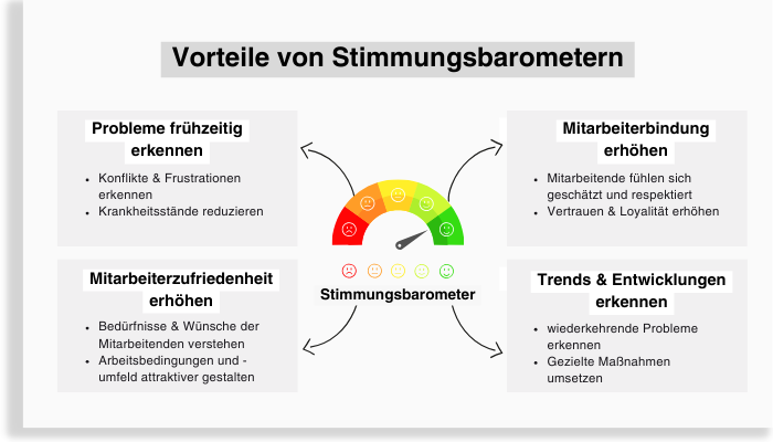 - Ziel: Stimmungsbarometer dienen der Verbesserung des Betriebsklimas und der Mitarbeiterzufriedenheit.